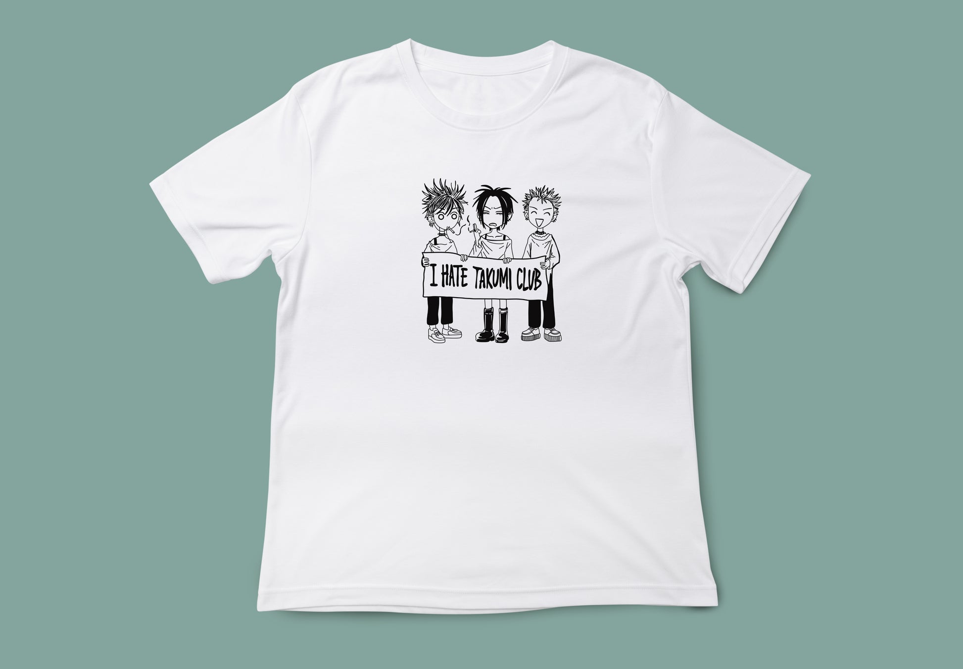 Confeccionada en algodón 100%, suave y resistente, esta camiseta unisex presenta una ilustración exclusiva en estilo manga donde los miembros del improvisado club sostienen un cartel con la frase: “I Hate Takumi Club”. Un guiño directo para verdaderos fans que saben lo que duele la historia y que prefieren llevar su pasión con humor e ironía.